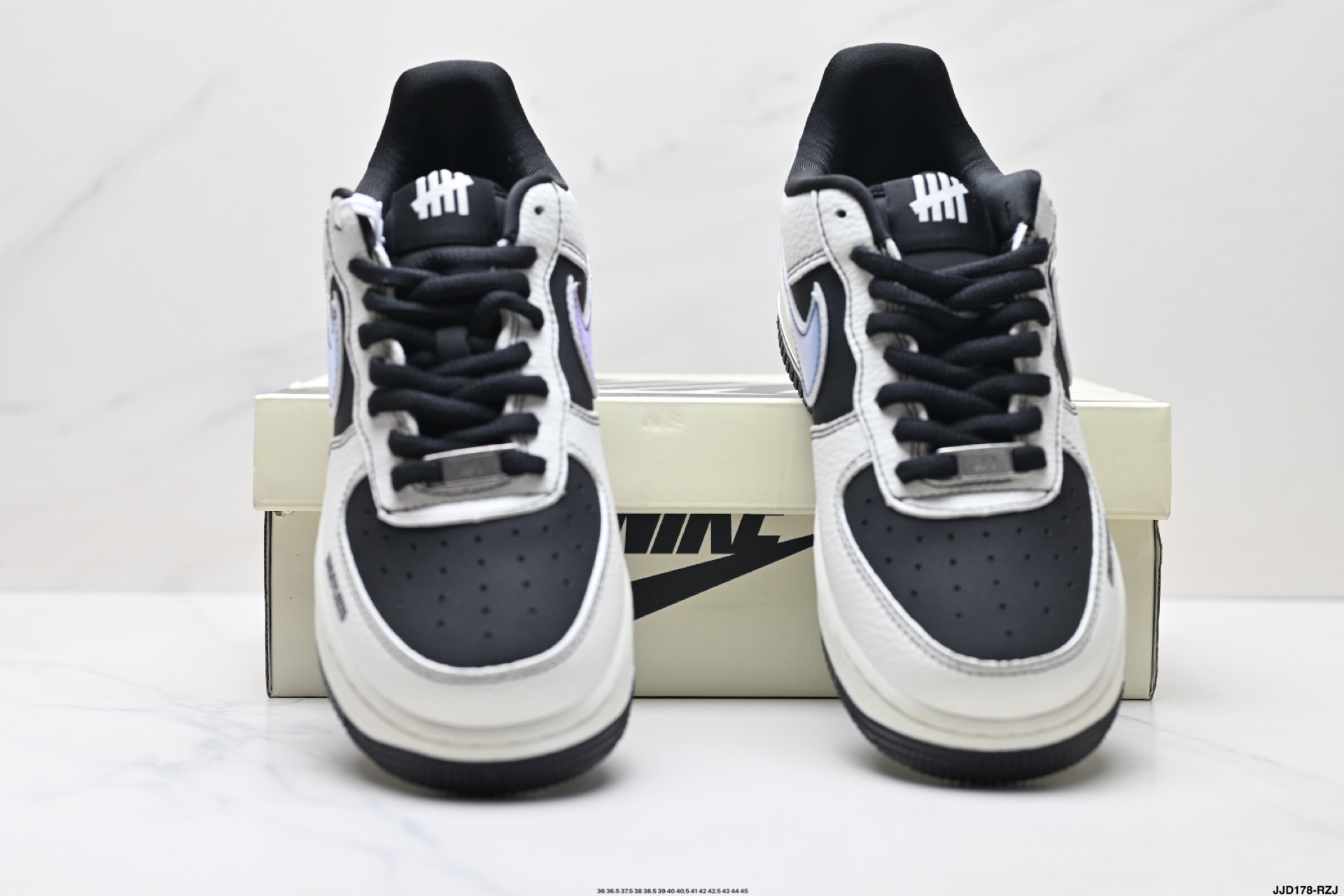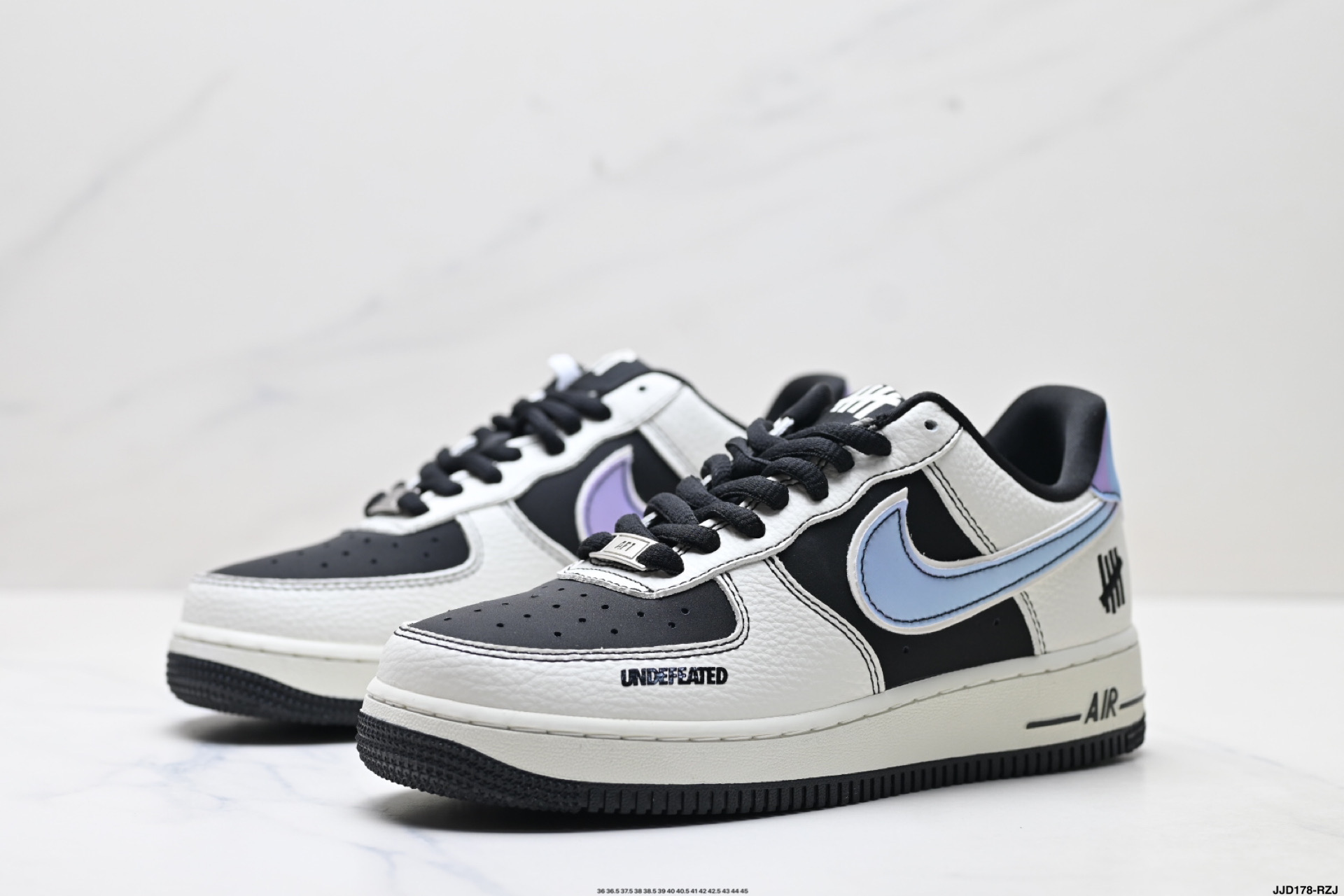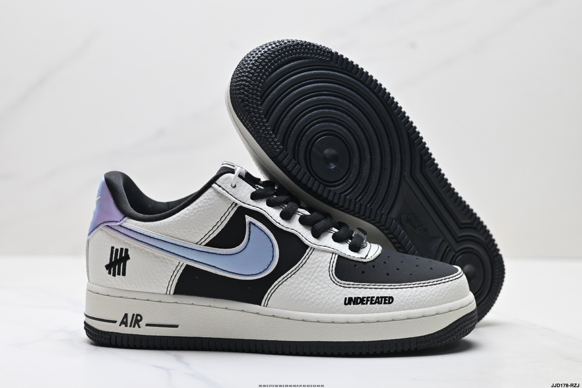 נעלי Nike Air Force 1 ’07 LV8 בעיצוב ייחודי, בשילוב צבעים שחור ולבן עם סוליית אוויר של Undefeated. זמינות במידות 36-45.