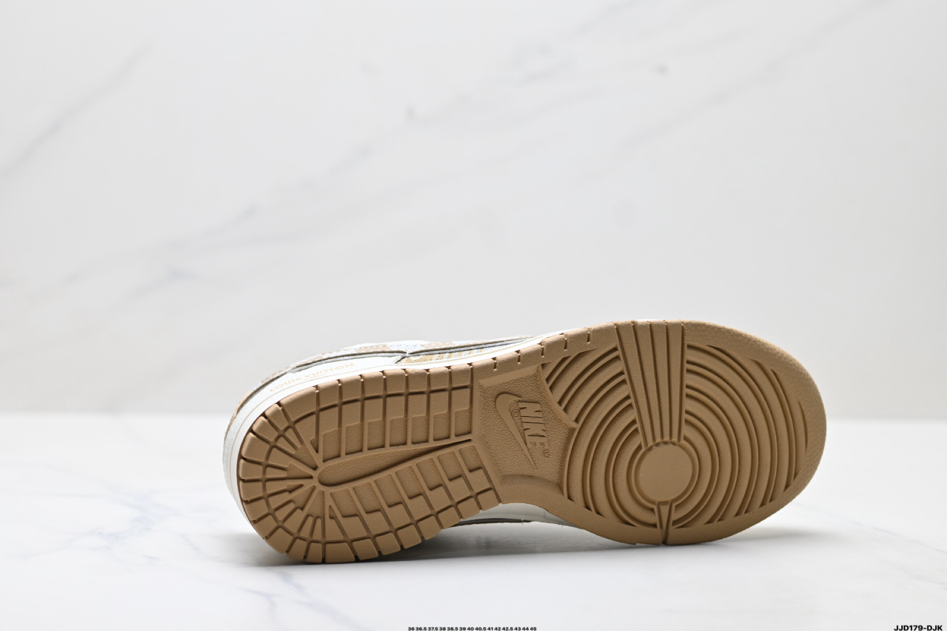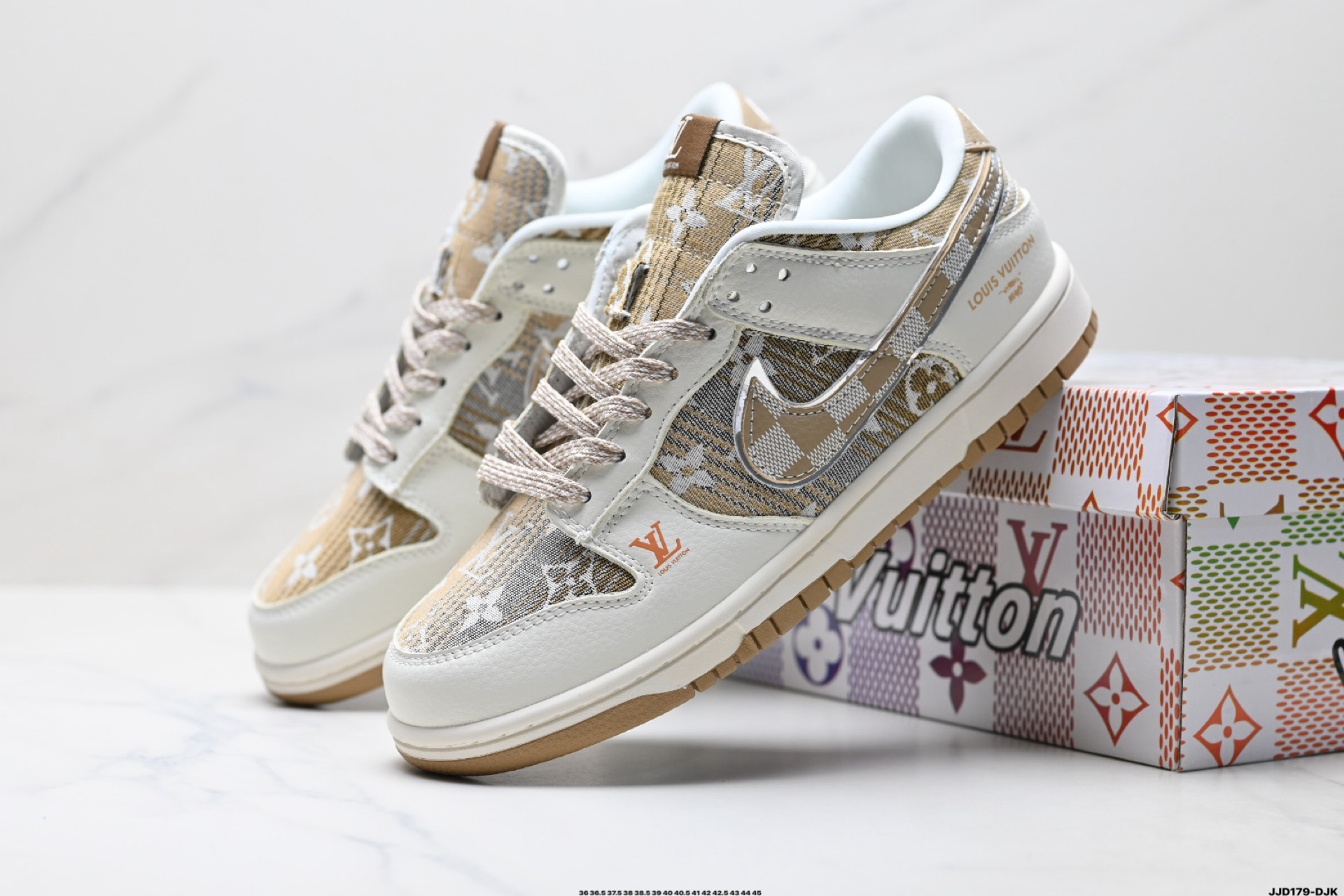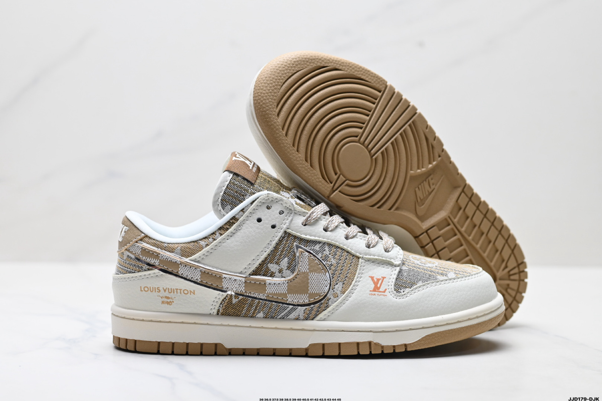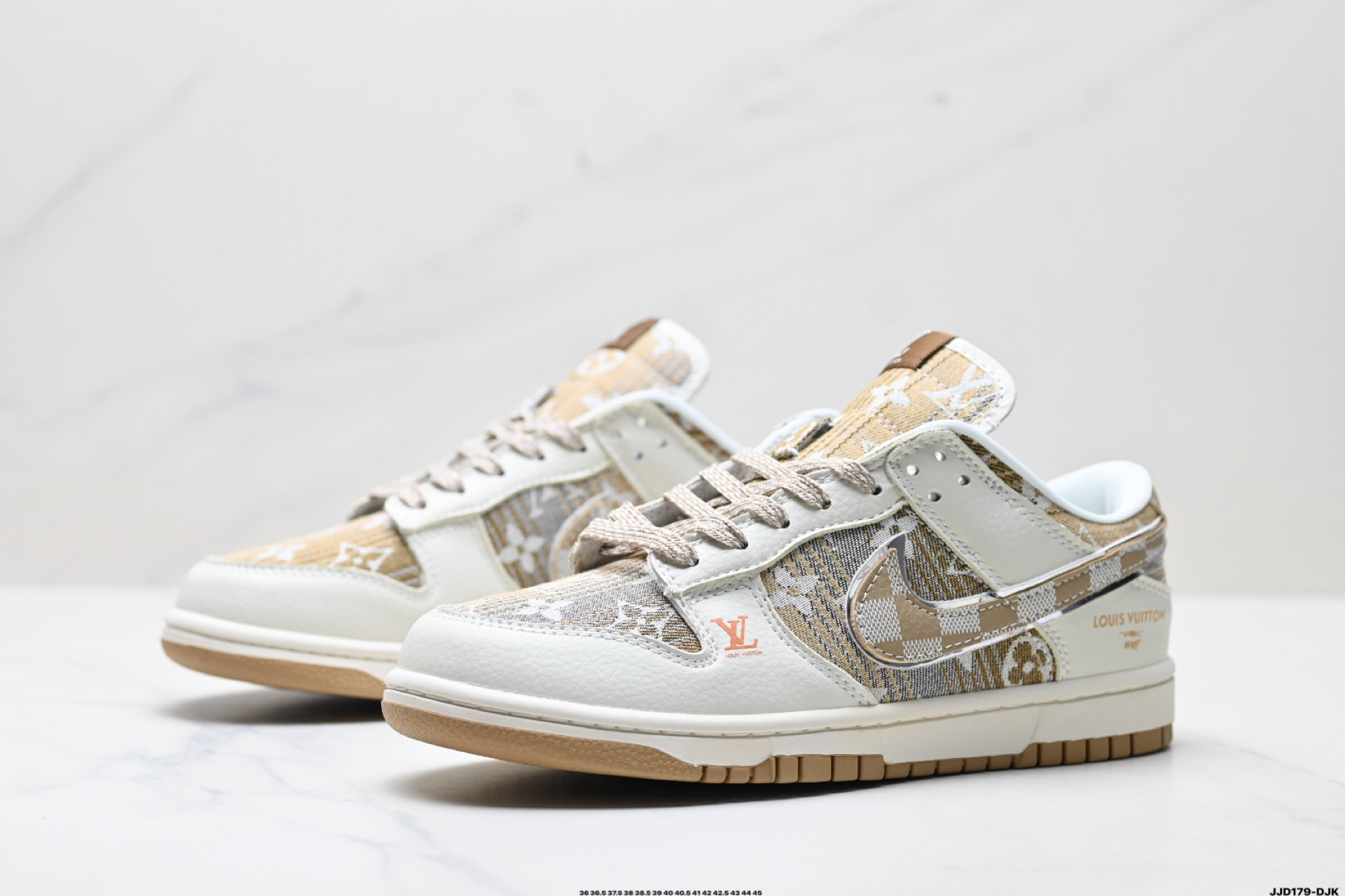 נעלי Nike Dunk Low בעיצוב לואי ויטון, חומרים פרימיום ונוחות מירבית. שילוב מושלם בין אופנת רחוב לעיצוב יוקרתי.
